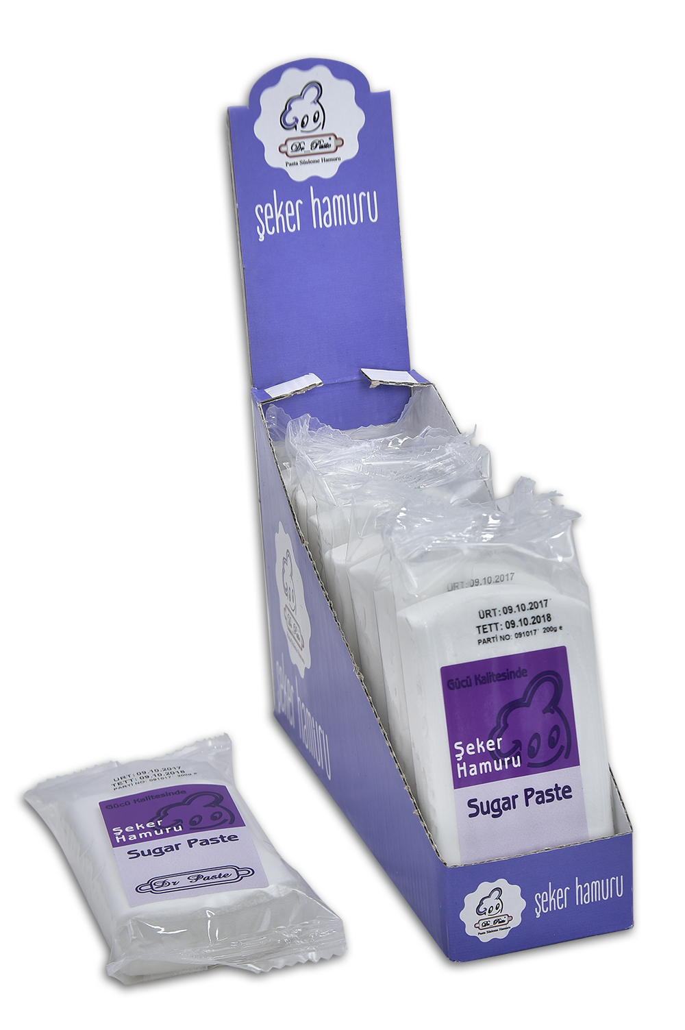 Dr Paste şeker hamuru ISO 9001 ve ISO 22000 Kalite belgelerine sahip,el değmeden üretilmiş,sağlıklı,mükemmel kokulu ve lezzetli özel bir hamurdur.Diğer şeker hamurlarına göre daha yumuşak ve esnektir.Pasta,kurabiye ve diğer şeker hamuru ile yapılan kaplamalarda çatlama yapmadığı gibi istenilen her şekli rahatlıkla alabilir.