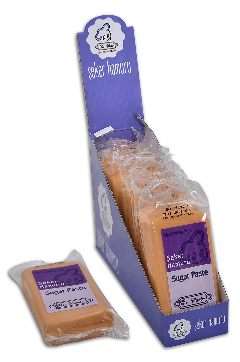 Dr Paste şeker hamuru ISO 9001 ve ISO 22000 Kalite belgelerine sahip,el değmeden üretilmiş,sağlıklı,mükemmel kokulu ve lezzetli özel bir hamurdur.Diğer şeker hamurlarına göre daha yumuşak ve esnektir.Pasta,kurabiye ve diğer şeker hamuru ile yapılan kaplamalarda çatlama yapmadığı gibi istenilen her şekli rahatlıkla alabilir.